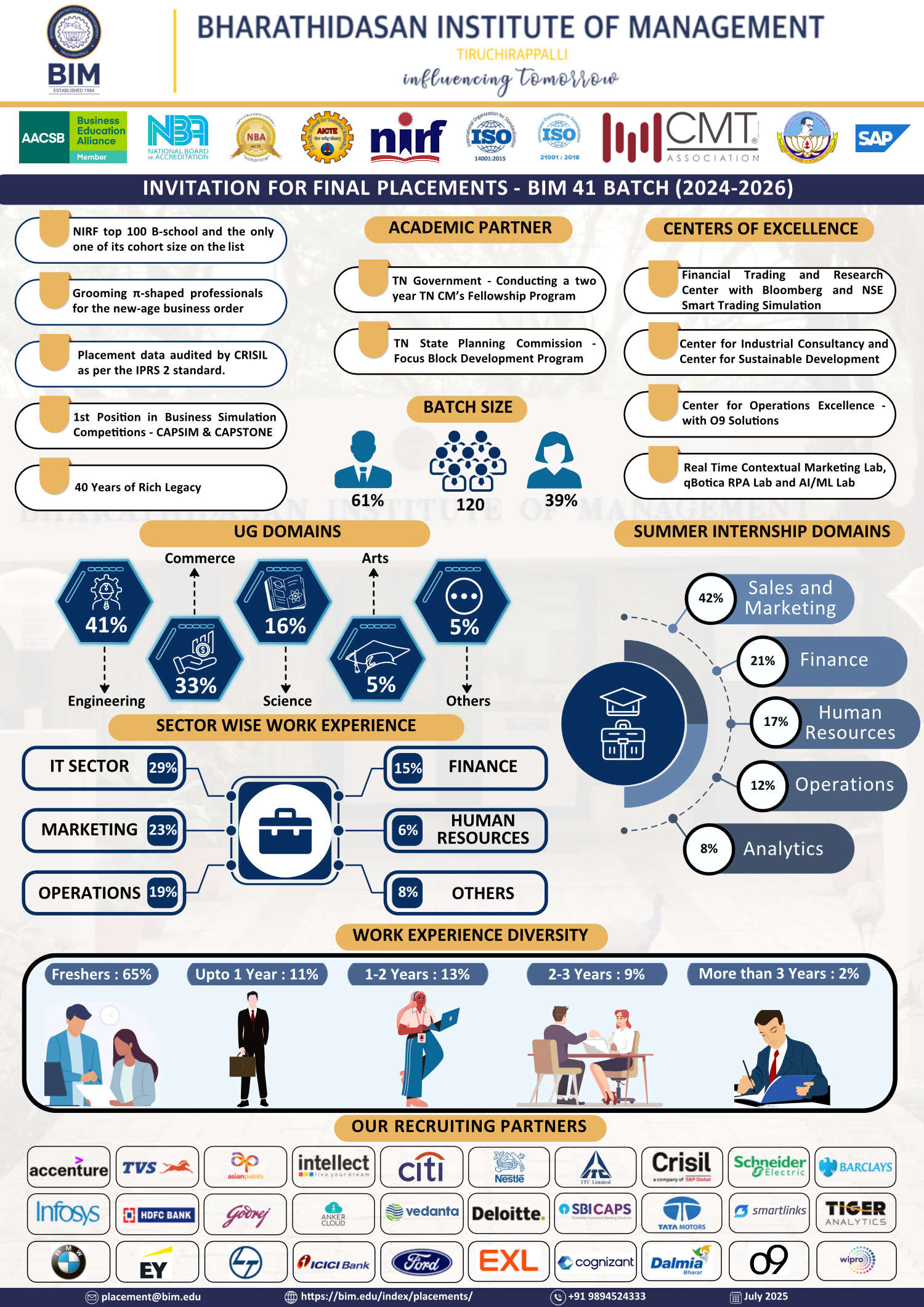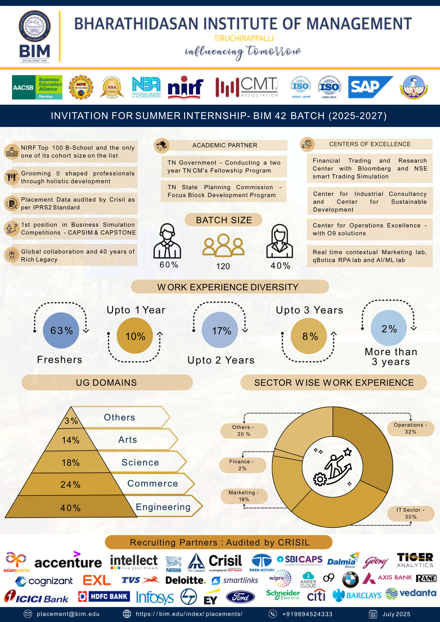 BIM follows an engagement-driven placement policy. BIM encourages corporates to participate in curriculum design and sponsor and deliver some courses. We extensively engage with corporates to offer courses in new technology areas such as Digital HR, HR Analytics, Fintech, Blockchain applications, Derivative analytics, AI/ML, Robotic Process Automation, Advanced Marketing Analytics, ESG reporting, Green Finance, Digital Supply Chain, etc. This engagement model provides a platform for the recruiters to spot their future talents and guide them in planning their elective courses to make them productive from their first day at work. This engagement model allows the candidates to reflect on the work they would love to do. As a result of these engagement-driven placement initiatives, BIM students demonstrate a very high retention rate, resulting in recruiters’ satisfaction. Since 2022, we have started auditing our placement data by CRISIL, per the Indian Placement Reporting Standard (IPRS2) championed by IIM Ahmedabad and SPJIMR. BIM is among the select few B Schools in India to report the placement data as per IPRS 2 standard. BIM consistently witnesses 100% placement of its qualified graduates.